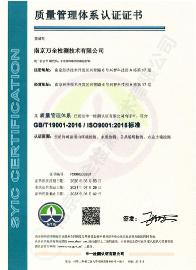 南京萬(wàn)全檢測(cè)技術(shù)有限公司,籌建于2013年1月,注冊(cè)資金500萬(wàn),公司坐落于南京經(jīng)濟(jì)技術(shù)開(kāi)發(fā)區(qū)興智路6號(hào)興智科技園A棟17層,實(shí)驗(yàn)室占地面積1750余平米。公司是一家獲得省級(jí)CMA計(jì)量認(rèn)證資質(zhì)、具有獨(dú)立法人、政府認(rèn)可的綜合性、專(zhuān)業(yè)性的檢測(cè)機(jī)構(gòu)。環(huán)境監(jiān)測(cè)業(yè)務(wù)是其重要的檢測(cè)業(yè)務(wù)之一,目前已獲得省級(jí)計(jì)量資格認(rèn)可項(xiàng)目314項(xiàng),設(shè)備齊全,具有較強(qiáng)的技術(shù)能力。